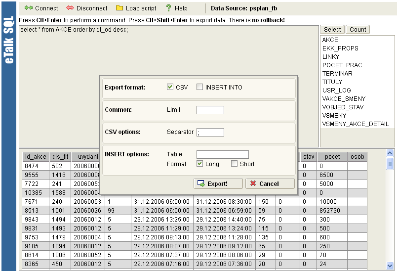eTalk je užitečný pomocník databázového správce a programátora. Je to webová aplikace, která umožňuje interaktivně zadávat SQL dotazy a prohlížet si jejich výsledek. Poskytuje:
