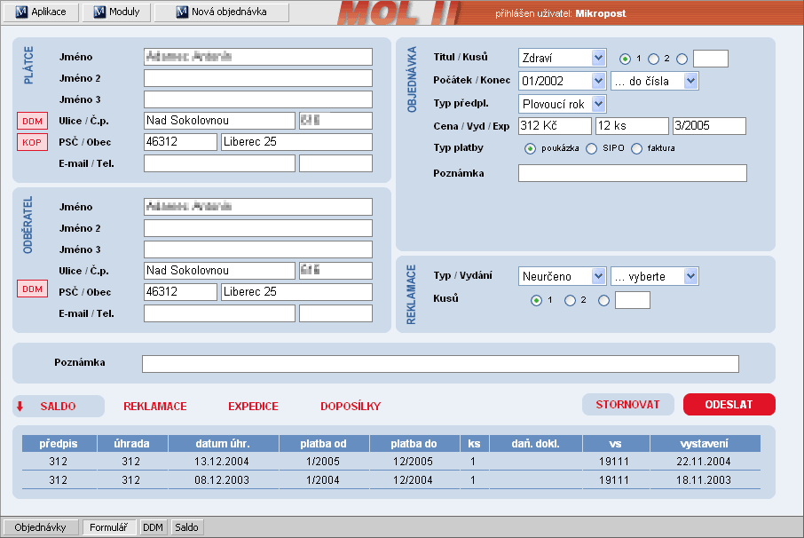 komplexní formulář s průhledy do salda, expedice a reklamací